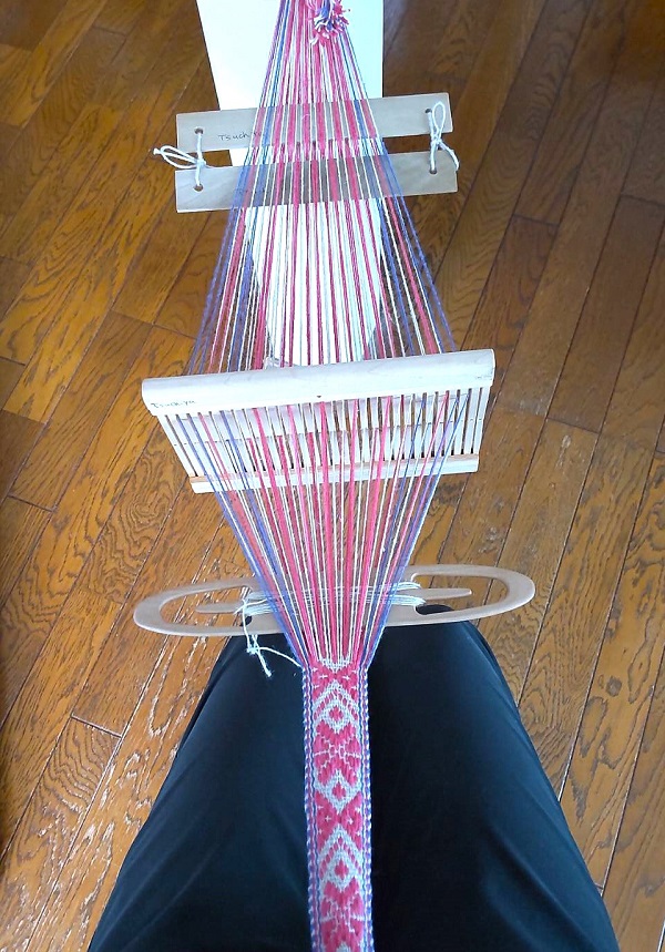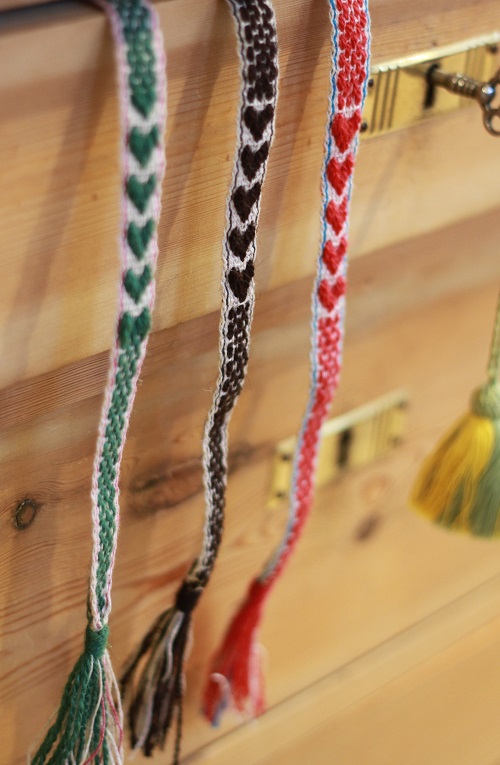スウェーデンのカラフルな毛糸と麻糸をたて糸に、リード(筬)を使用したバンド織の技法で、ハートの模様になるよう色糸をピックアップして柄を出していきます。 今回は出来上がった作品でブレスレットを作ってみましょう。 長く織ると帽子に巻いたり、シャツの袖飾りなどにご使用いただけます。