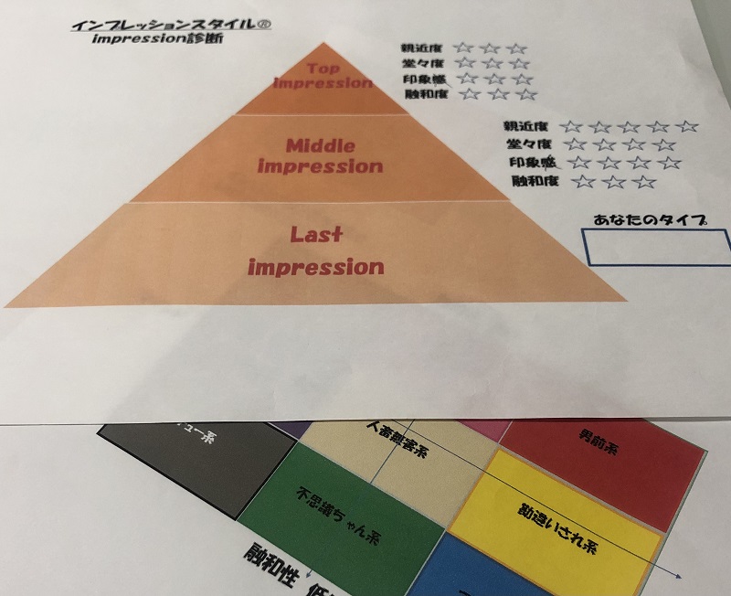 「あなたは人からどのような印象を持たれていますか?」 香水のトップ、ミドル、ラストノートのように、 時間と共に人の印象は3回変わります。 一色由美子のインプレッションスタイル®は、 『顔立ち×話し方×マインド』の3段階の診断を行う 今までになかった新しいイメージコンサルティング手法です。